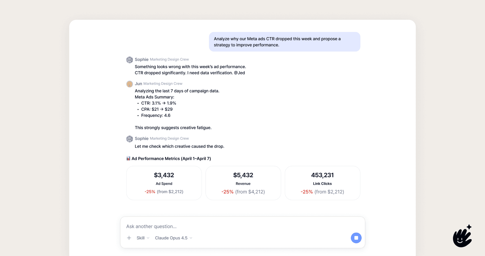 Our marketing agent does not just answer questions. It analyzes performance, generates dashboards, suggests next actions, researches competitors, and helps create new ad creatives.