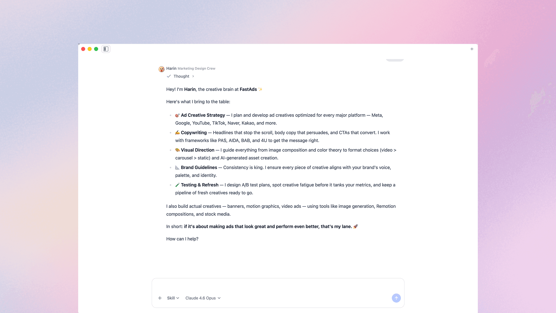 Harin is designed to do more than generate visuals. She understands the context behind your advertising — your product, your service, your target audience — and produces creatives that reflect it. Rather than generating generic, template-driven output, Harin crafts messaging and visual treatments that are specific to your brand positioning and performance objectives.